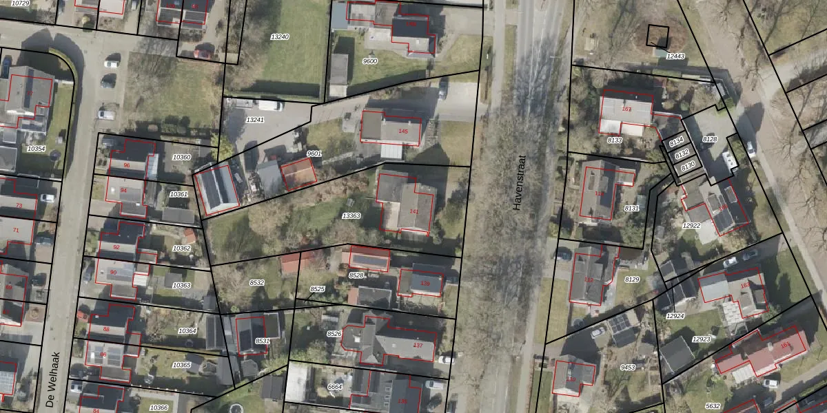 Het perceel waarop Havenstraat 141 staat heeft een oppervlakte van 1075 m². Dit is een zeer groot perceel. De perceeloppervlakte wordt geregistreerd door het Kadaster. Gedetailleerde informatie over de maten van dit perceel kunt u vinden in het rapport Kadastrale kaart met maatvoering van Havenstraat 141.