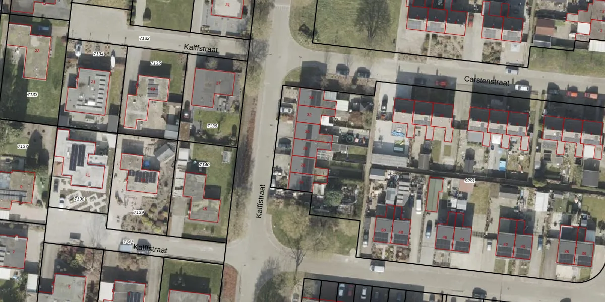 Het perceel waarop Kalffstraat 28 staat heeft een oppervlakte van 5940 m². Dit is een zeer groot perceel. De perceeloppervlakte wordt geregistreerd door het Kadaster. Gedetailleerde informatie over de maten van dit perceel kunt u vinden in het rapport Kadastrale kaart met maatvoering van Kalffstraat 28.