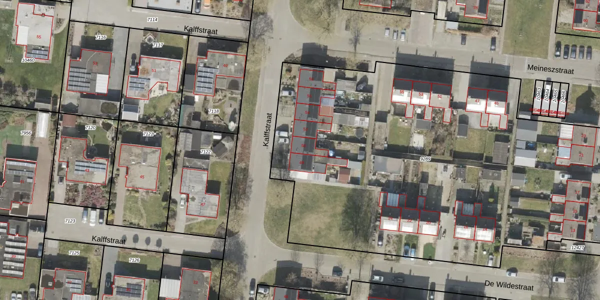 Het perceel waarop Kalffstraat 50 staat heeft een oppervlakte van 6077 m². Dit is een zeer groot perceel. De perceeloppervlakte wordt geregistreerd door het Kadaster. Gedetailleerde informatie over de maten van dit perceel kunt u vinden in het rapport Kadastrale kaart met maatvoering van Kalffstraat 50.