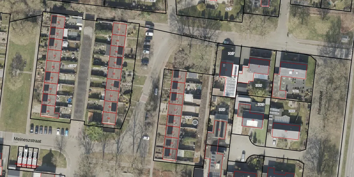 Het perceel waarop Meineszstraat 13 staat heeft een oppervlakte van 1464 m². Dit is een zeer groot perceel. De perceeloppervlakte wordt geregistreerd door het Kadaster. Gedetailleerde informatie over de maten van dit perceel kunt u vinden in het rapport Kadastrale kaart met maatvoering van Meineszstraat 13.