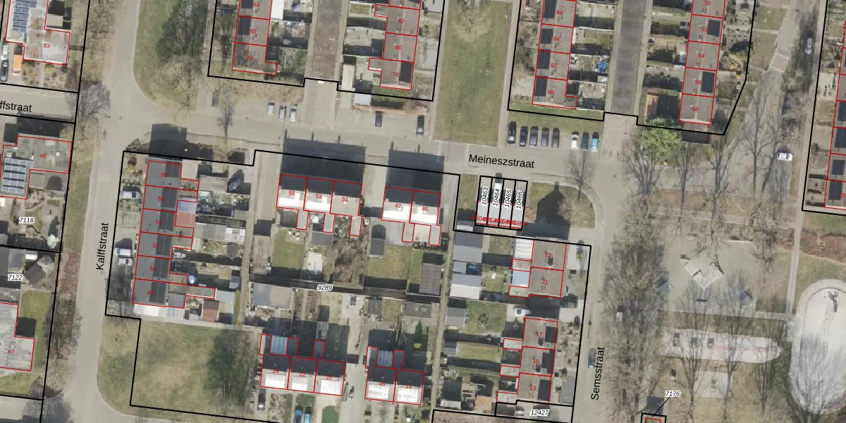 Het perceel waarop Meineszstraat 45 staat heeft een oppervlakte van 6077 m². Dit is een zeer groot perceel. De perceeloppervlakte wordt geregistreerd door het Kadaster. Gedetailleerde informatie over de maten van dit perceel kunt u vinden in het rapport Kadastrale kaart met maatvoering van Meineszstraat 45.
