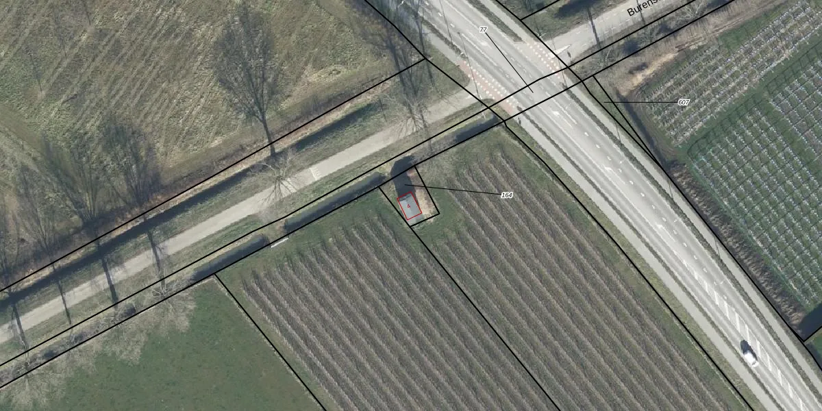 Het adres is gelegen op perceel 164 in de sectie P en de kadastrale gemeente Buren. De kadastrale aanduiding is aldus BRN00-P-164. Het perceel is kleiner dan gemiddeld in Buren. Het perceel is 111 m² groot, terwijl het gemiddelde ligt op 7189,71 m². Het kleinste perceel in de kadastrale gemeente is 0 m² groot. De grootste perceeloppervlakte is 39,7 ha. Er zijn geen andere adressen aanwezig op het perceel. In de Basisregistratie Kadaster (BRK) werden de grenzen van het perceel geregistreerd op 07-05-2002.