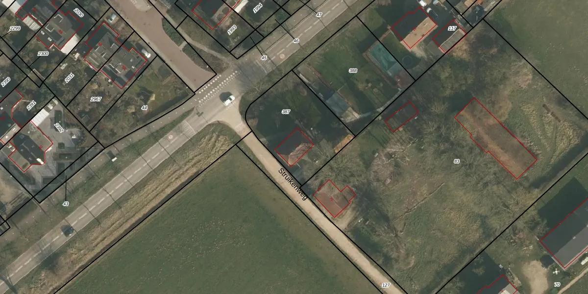Struikenweg 1 is gelegen op kadastraal perceel OOI00G387. Deze kadastrale aanduiding is uniek en wordt gebruikt door het Kadaster om eigendomsrechten en andere zakelijke rechten vast te leggen. Het perceel maakt onderdeel uit van de kadastrale gemeente Ooij.