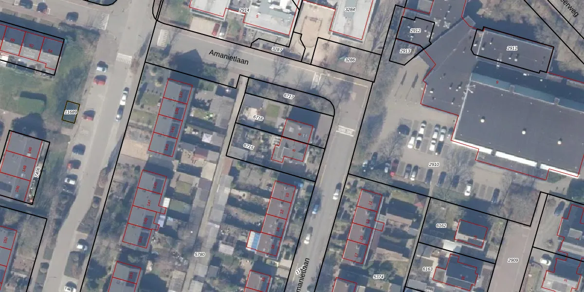 Het perceel waarop Amanietlaan 8 staat heeft een oppervlakte van 369 m². Dit is een groot perceel. De perceeloppervlakte wordt geregistreerd door het Kadaster. Gedetailleerde informatie over de maten van dit perceel kunt u vinden in het rapport Kadastrale kaart met maatvoering van Amanietlaan 8.