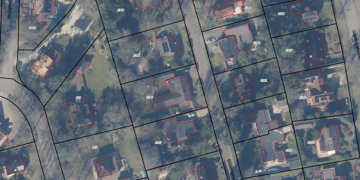 Het perceel waarop Bilderdijklaan 7 staat heeft een oppervlakte van 1077 m². Dit is een zeer groot perceel. De perceeloppervlakte wordt geregistreerd door het Kadaster. Gedetailleerde informatie over de maten van dit perceel kunt u vinden in het rapport Kadastrale kaart met maatvoering van Bilderdijklaan 7.