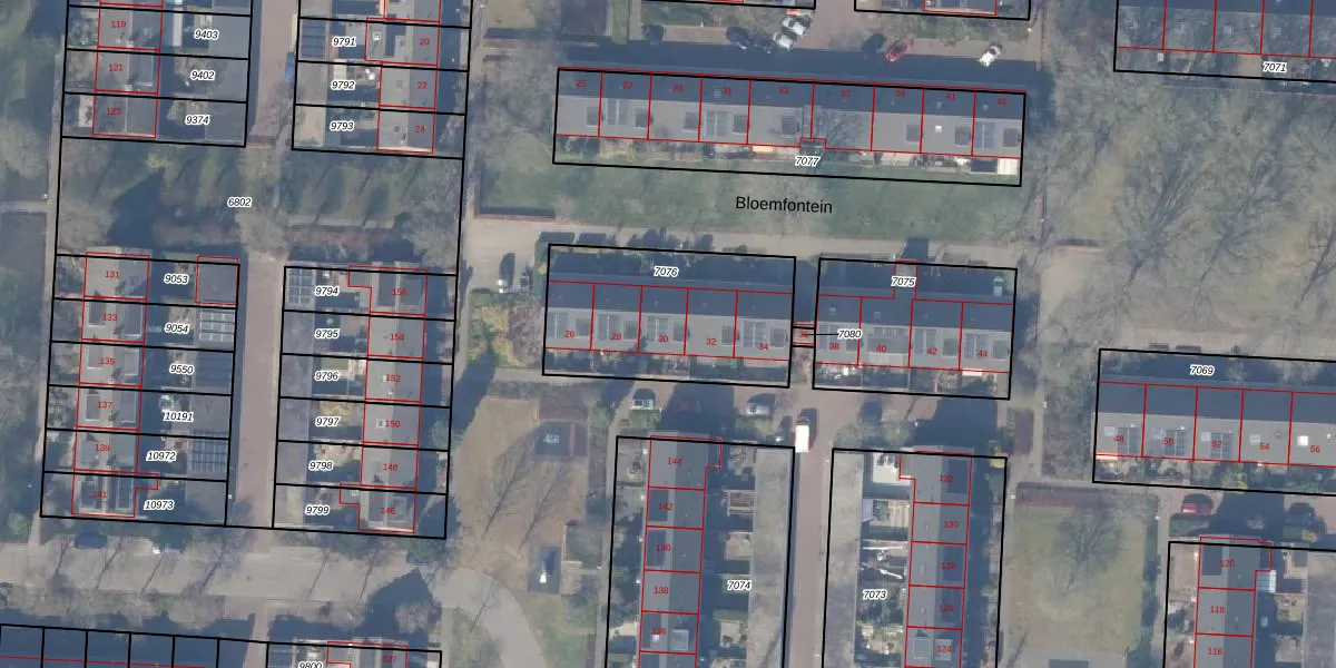 Het perceel waarop Bloemfontein 30 staat heeft een oppervlakte van 710 m². Dit is een groot perceel. De perceeloppervlakte wordt geregistreerd door het Kadaster. Gedetailleerde informatie over de maten van dit perceel kunt u vinden in het rapport Kadastrale kaart met maatvoering van Bloemfontein 30.
