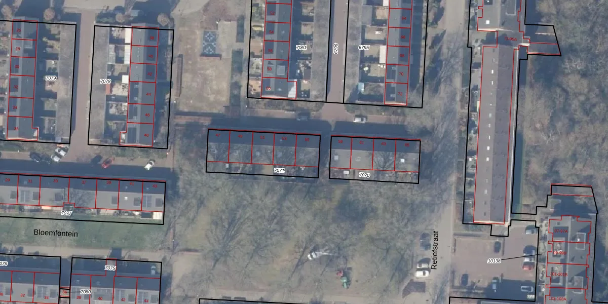 Het perceel waarop Bloemfontein 55 staat heeft een oppervlakte van 516 m². Dit is een groot perceel. De perceeloppervlakte wordt geregistreerd door het Kadaster. Gedetailleerde informatie over de maten van dit perceel kunt u vinden in het rapport Kadastrale kaart met maatvoering van Bloemfontein 55.
