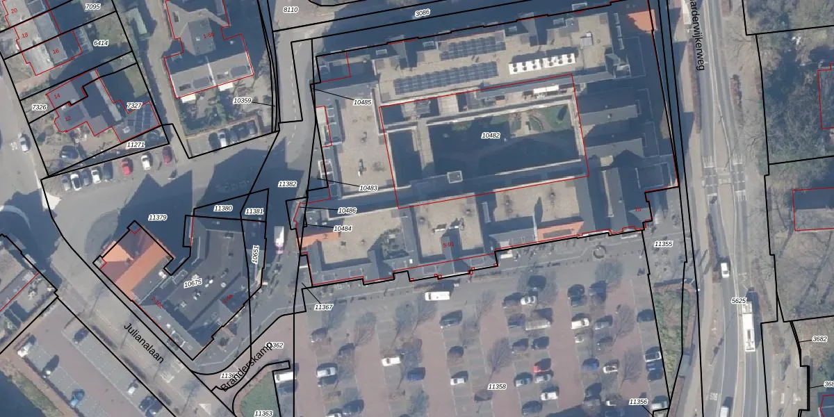 Het adres is gelegen op perceel 10482 in de sectie F en de kadastrale gemeente Ermelo. De kadastrale aanduiding is aldus EML00-F-10482. Het perceel is 4655 m² groot. Dat is kleiner dan de gemiddelde perceeloppervlakte in Ermelo, dat op 5291,54 m² ligt. De grootste perceeloppervlakte in de kadastrale gemeente is 3,90 km². De kleinste oppervlakte bedraagt 0 m². Er zijn 71 adressen aanwezig op het perceel. In de Basisregistratie Kadaster (BRK) werden de grenzen van het perceel geregistreerd op 25-06-2021.