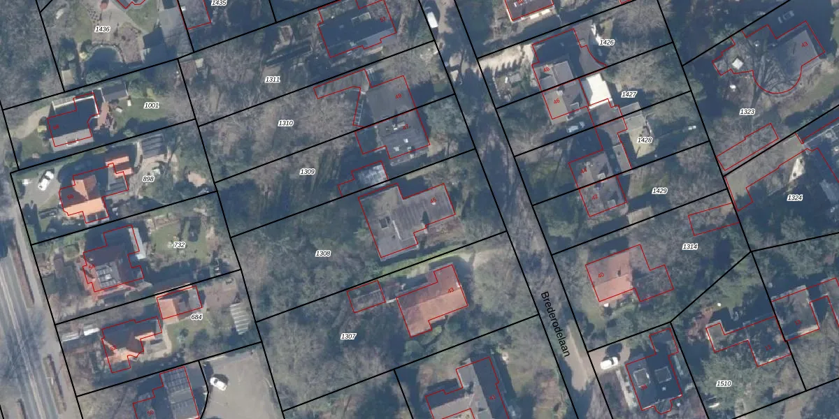 Het perceel waarop Brederodelaan 45 staat heeft een oppervlakte van 1337 m². Dit is een zeer groot perceel. De perceeloppervlakte wordt geregistreerd door het Kadaster. Gedetailleerde informatie over de maten van dit perceel kunt u vinden in het rapport Kadastrale kaart met maatvoering van Brederodelaan 45.