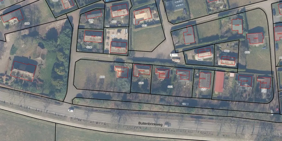Buitenbrinkweg 14-109 is gelegen op kadastraal perceel EML00I6263. Deze kadastrale aanduiding is uniek en wordt gebruikt door het Kadaster om eigendomsrechten en andere zakelijke rechten vast te leggen. Het perceel maakt onderdeel uit van de kadastrale gemeente Ermelo.