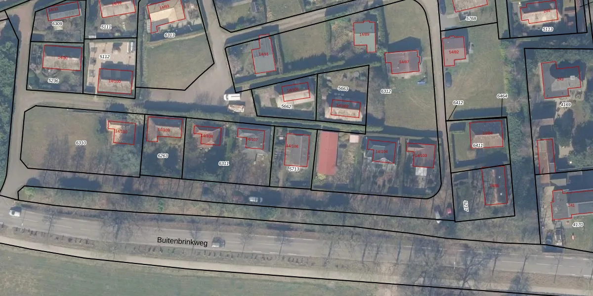 Buitenbrinkweg 14-106 is gelegen op kadastraal perceel EML00I5713. Deze kadastrale aanduiding is uniek en wordt gebruikt door het Kadaster om eigendomsrechten en andere zakelijke rechten vast te leggen. Het perceel maakt onderdeel uit van de kadastrale gemeente Ermelo.