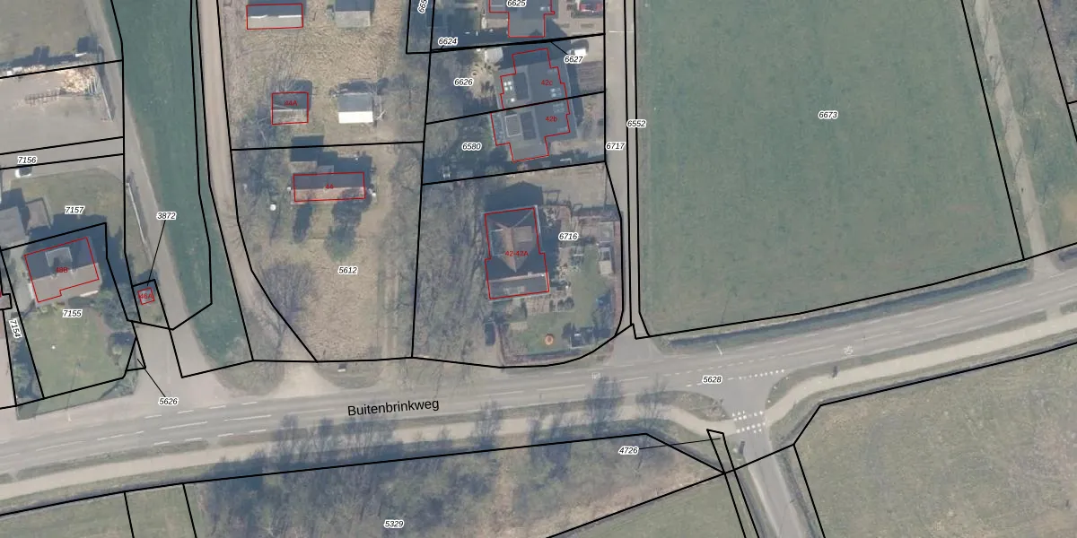 Het perceel waarop Buitenbrinkweg 42 staat heeft een oppervlakte van 1397 m². Dit is een zeer groot perceel. De perceeloppervlakte wordt geregistreerd door het Kadaster. Gedetailleerde informatie over de maten van dit perceel kunt u vinden in het rapport Kadastrale kaart met maatvoering van Buitenbrinkweg 42.