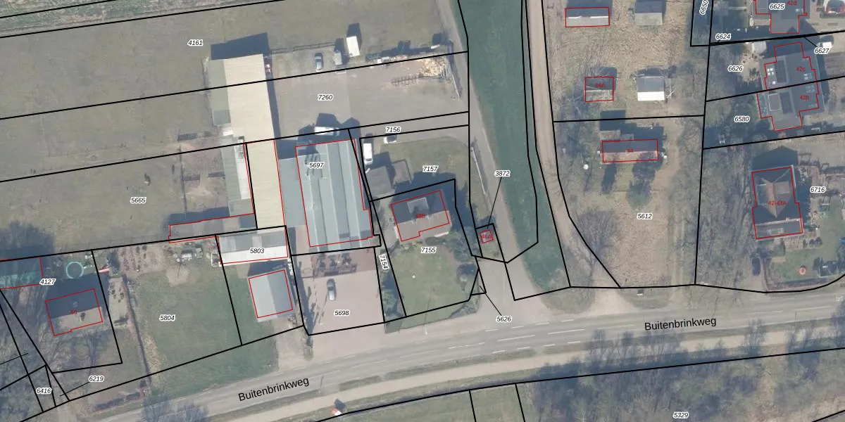 Het perceel waarop Buitenbrinkweg 48-B staat heeft een oppervlakte van 511 m². Dit is een groot perceel. De perceeloppervlakte wordt geregistreerd door het Kadaster. Gedetailleerde informatie over de maten van dit perceel kunt u vinden in het rapport Kadastrale kaart met maatvoering van Buitenbrinkweg 48-B.