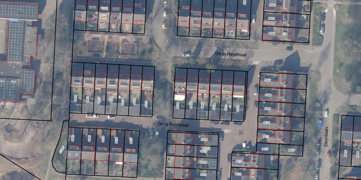Het perceel waarop De la Reystraat 154 staat heeft een oppervlakte van 186 m². Dit is een middelgroot perceel. De perceeloppervlakte wordt geregistreerd door het Kadaster. Gedetailleerde informatie over de maten van dit perceel kunt u vinden in het rapport Kadastrale kaart met maatvoering van De la Reystraat 154.