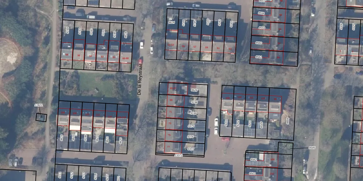 Het perceel waarop De la Reystraat 65 staat heeft een oppervlakte van 176 m². Dit is een middelgroot perceel. De perceeloppervlakte wordt geregistreerd door het Kadaster. Gedetailleerde informatie over de maten van dit perceel kunt u vinden in het rapport Kadastrale kaart met maatvoering van De la Reystraat 65.