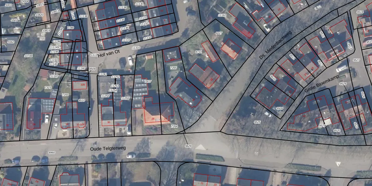 Het perceel waarop Ds. Medenbachweg 40 staat heeft een oppervlakte van 556 m². Dit is een groot perceel. De perceeloppervlakte wordt geregistreerd door het Kadaster. Gedetailleerde informatie over de maten van dit perceel kunt u vinden in het rapport Kadastrale kaart met maatvoering van Ds. Medenbachweg 40.