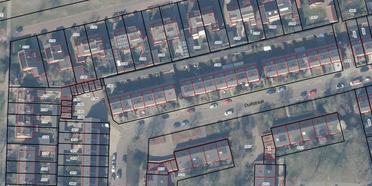 Het perceel waarop Duifstraat 31 staat heeft een oppervlakte van 3286 m². Dit is een zeer groot perceel. De perceeloppervlakte wordt geregistreerd door het Kadaster. Gedetailleerde informatie over de maten van dit perceel kunt u vinden in het rapport Kadastrale kaart met maatvoering van Duifstraat 31.