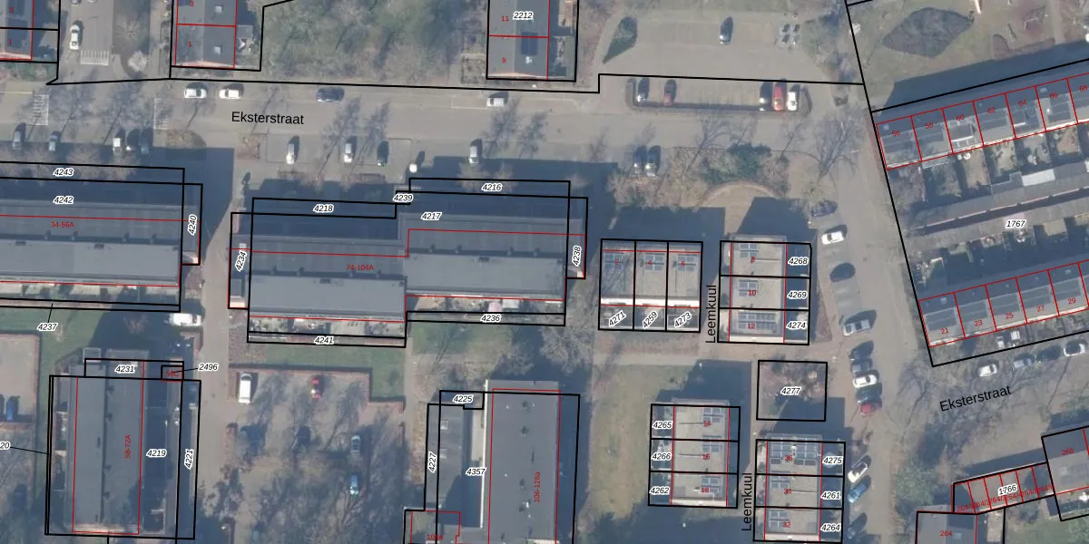 Het perceel waarop Eksterstraat 102 staat heeft een oppervlakte van 1305 m². Dit is een zeer groot perceel. De perceeloppervlakte wordt geregistreerd door het Kadaster. Gedetailleerde informatie over de maten van dit perceel kunt u vinden in het rapport Kadastrale kaart met maatvoering van Eksterstraat 102.