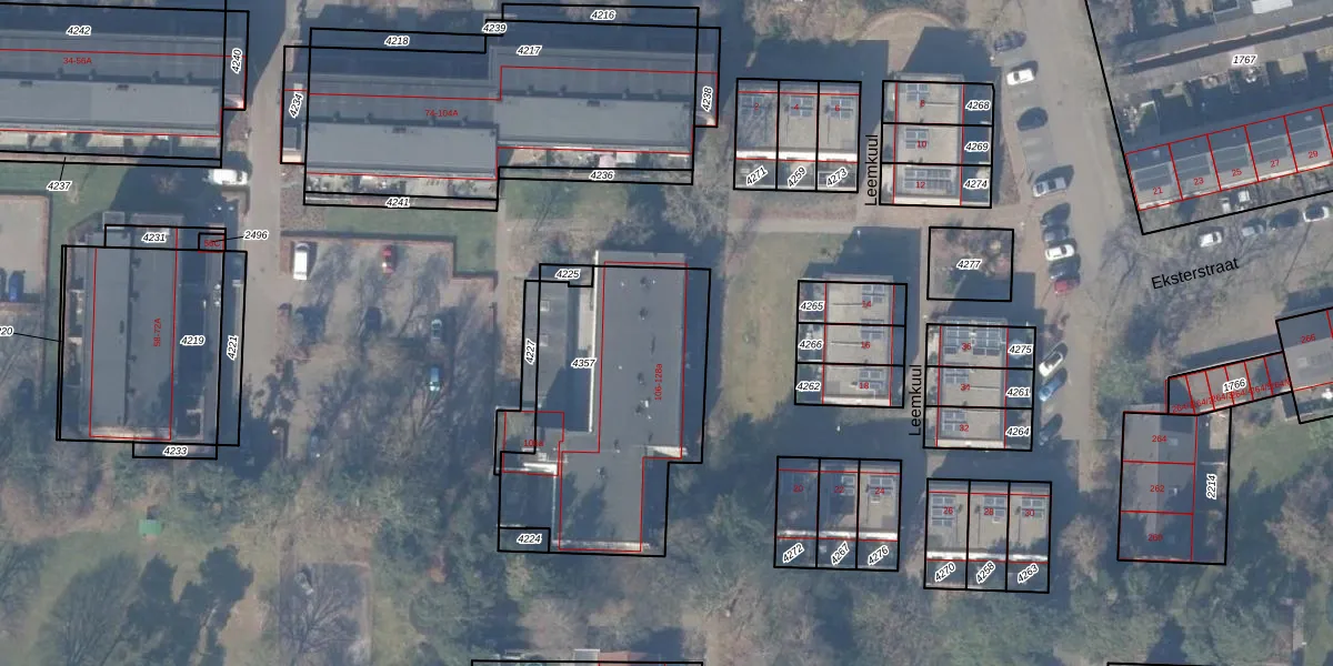 Het perceel waarop Eksterstraat 112 staat heeft een oppervlakte van 1042 m². Dit is een zeer groot perceel. De perceeloppervlakte wordt geregistreerd door het Kadaster. Gedetailleerde informatie over de maten van dit perceel kunt u vinden in het rapport Kadastrale kaart met maatvoering van Eksterstraat 112.