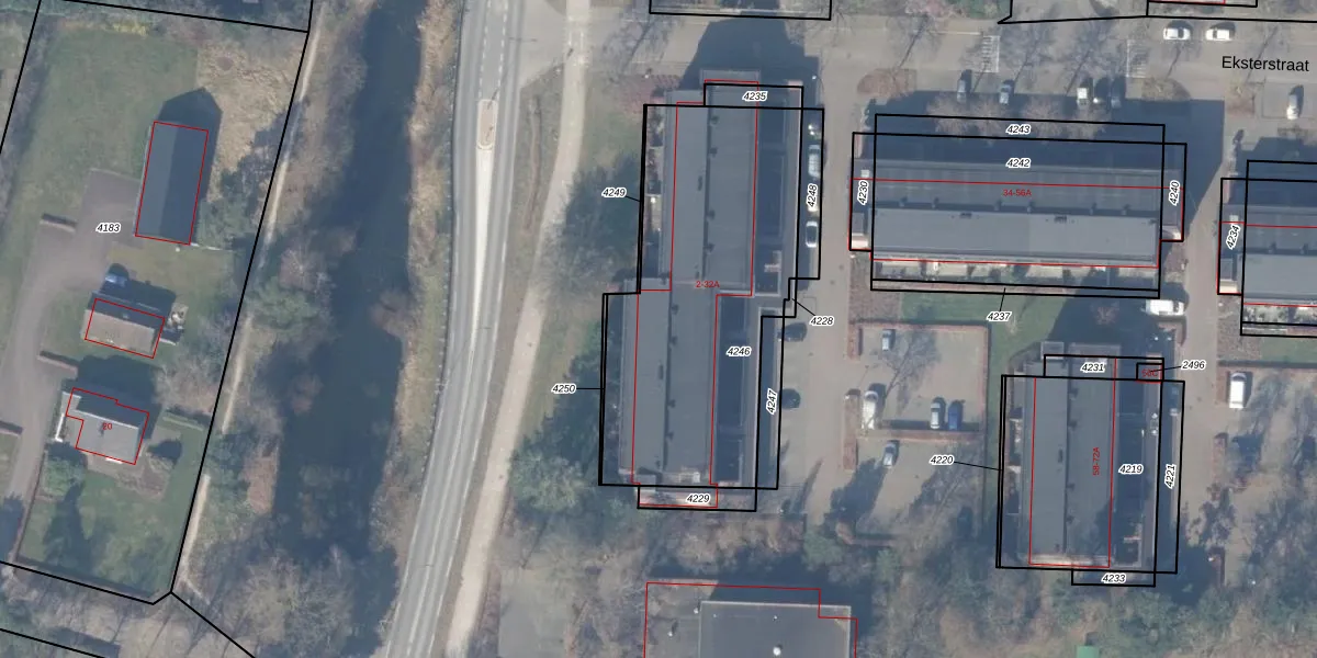 Het perceel waarop Eksterstraat 20 staat heeft een oppervlakte van 1372 m². Dit is een zeer groot perceel. De perceeloppervlakte wordt geregistreerd door het Kadaster. Gedetailleerde informatie over de maten van dit perceel kunt u vinden in het rapport Kadastrale kaart met maatvoering van Eksterstraat 20.