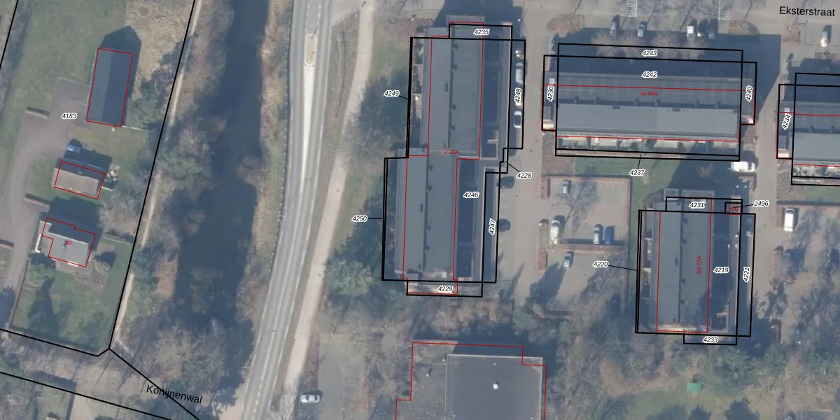 Het perceel waarop Eksterstraat 24 staat heeft een oppervlakte van 1372 m². Dit is een zeer groot perceel. De perceeloppervlakte wordt geregistreerd door het Kadaster. Gedetailleerde informatie over de maten van dit perceel kunt u vinden in het rapport Kadastrale kaart met maatvoering van Eksterstraat 24.