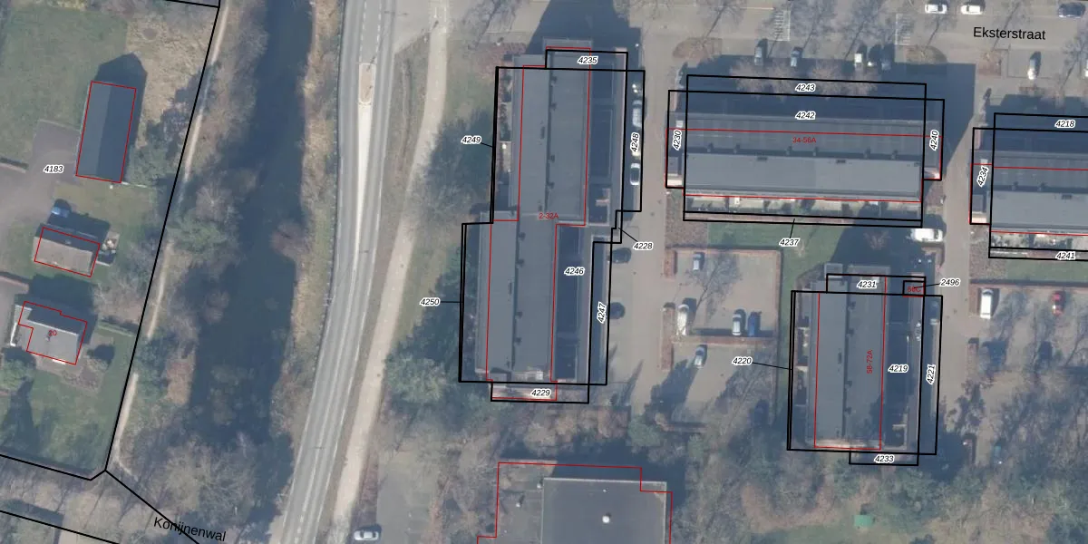 Het perceel waarop Eksterstraat 24-A staat heeft een oppervlakte van 1372 m². Dit is een zeer groot perceel. De perceeloppervlakte wordt geregistreerd door het Kadaster. Gedetailleerde informatie over de maten van dit perceel kunt u vinden in het rapport Kadastrale kaart met maatvoering van Eksterstraat 24-A.