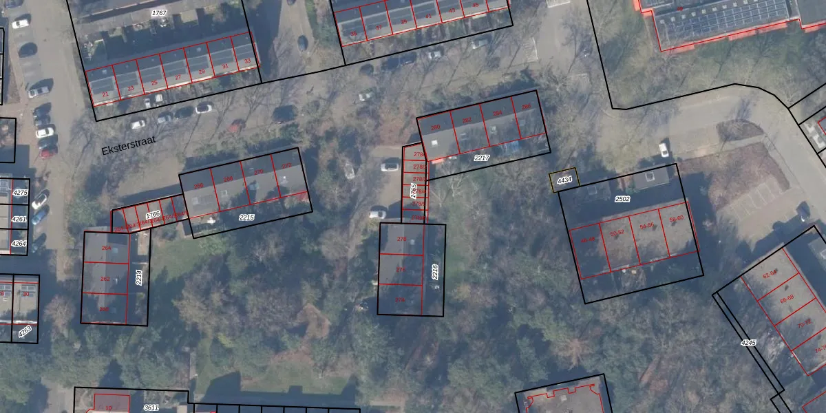 Het perceel waarop Eksterstraat 278-5 staat heeft een oppervlakte van 112 m². Dit is een middelgroot perceel. De perceeloppervlakte wordt geregistreerd door het Kadaster. Gedetailleerde informatie over de maten van dit perceel kunt u vinden in het rapport Kadastrale kaart met maatvoering van Eksterstraat 278-5.