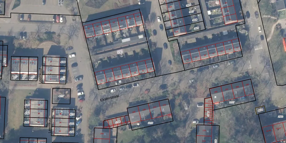 Het perceel waarop Eksterstraat 31 staat heeft een oppervlakte van 2037 m². Dit is een zeer groot perceel. De perceeloppervlakte wordt geregistreerd door het Kadaster. Gedetailleerde informatie over de maten van dit perceel kunt u vinden in het rapport Kadastrale kaart met maatvoering van Eksterstraat 31.