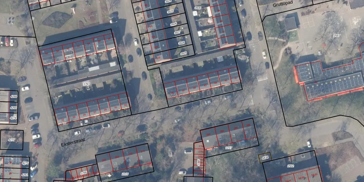Het perceel waarop Eksterstraat 37 staat heeft een oppervlakte van 2221 m². Dit is een zeer groot perceel. De perceeloppervlakte wordt geregistreerd door het Kadaster. Gedetailleerde informatie over de maten van dit perceel kunt u vinden in het rapport Kadastrale kaart met maatvoering van Eksterstraat 37.