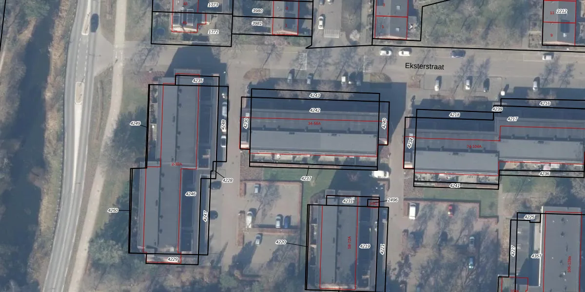 Eksterstraat 40 is gelegen op kadastraal perceel EML00G4242. Deze kadastrale aanduiding is uniek en wordt gebruikt door het Kadaster om eigendomsrechten en andere zakelijke rechten vast te leggen. Het perceel maakt onderdeel uit van de kadastrale gemeente Ermelo.