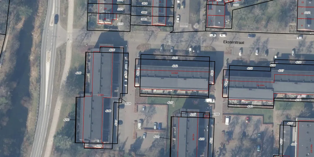 Eksterstraat 40-A is gelegen op kadastraal perceel EML00G4242. Deze kadastrale aanduiding is uniek en wordt gebruikt door het Kadaster om eigendomsrechten en andere zakelijke rechten vast te leggen. Het perceel maakt onderdeel uit van de kadastrale gemeente Ermelo.