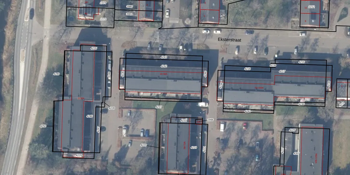 Eksterstraat 46 is gelegen op kadastraal perceel EML00G4242. Deze kadastrale aanduiding is uniek en wordt gebruikt door het Kadaster om eigendomsrechten en andere zakelijke rechten vast te leggen. Het perceel maakt onderdeel uit van de kadastrale gemeente Ermelo.