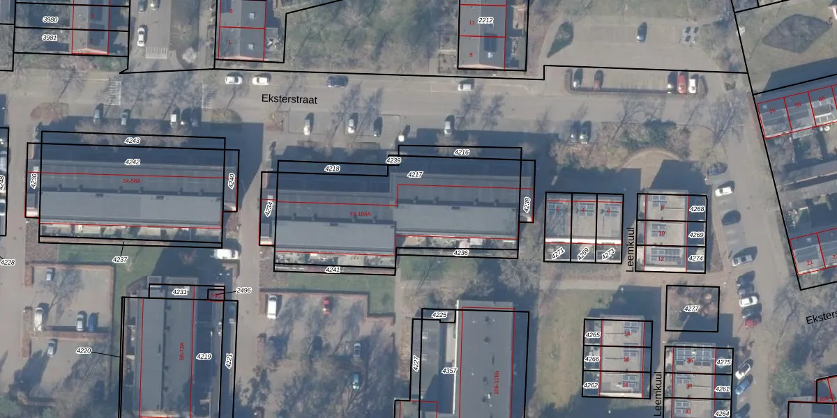 Het perceel waarop Eksterstraat 90 staat heeft een oppervlakte van 1305 m². Dit is een zeer groot perceel. De perceeloppervlakte wordt geregistreerd door het Kadaster. Gedetailleerde informatie over de maten van dit perceel kunt u vinden in het rapport Kadastrale kaart met maatvoering van Eksterstraat 90.