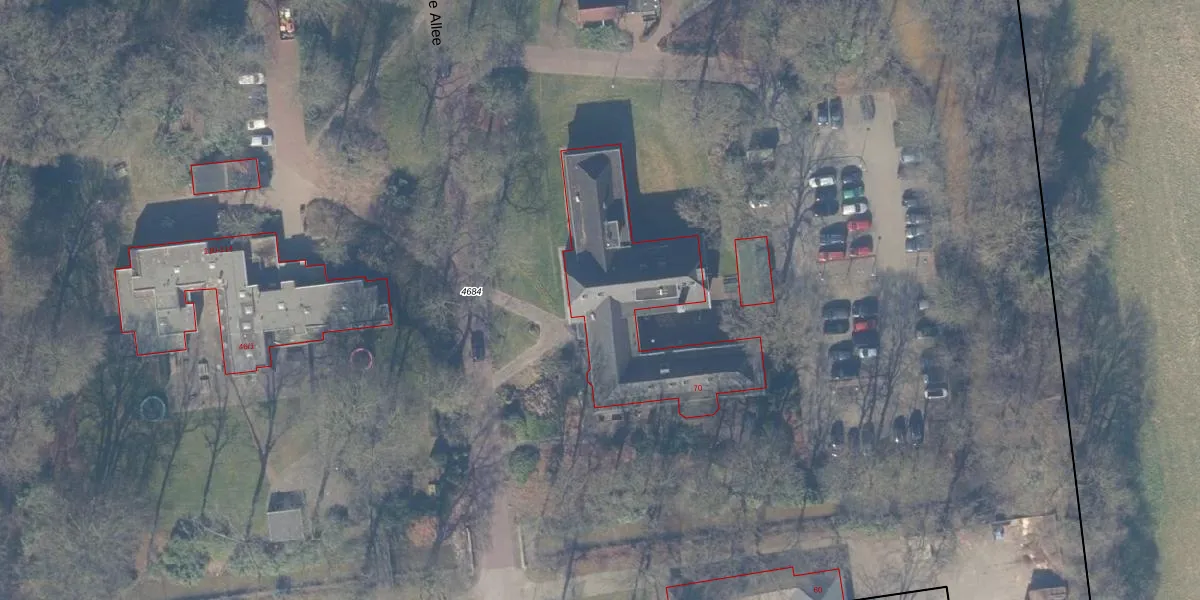 Het perceel waarop Groene Allee 70 staat heeft een oppervlakte van 4,8 ha. Dit is een zeer groot perceel. De perceeloppervlakte wordt geregistreerd door het Kadaster. Gedetailleerde informatie over de maten van dit perceel kunt u vinden in het rapport Kadastrale kaart met maatvoering van Groene Allee 70.