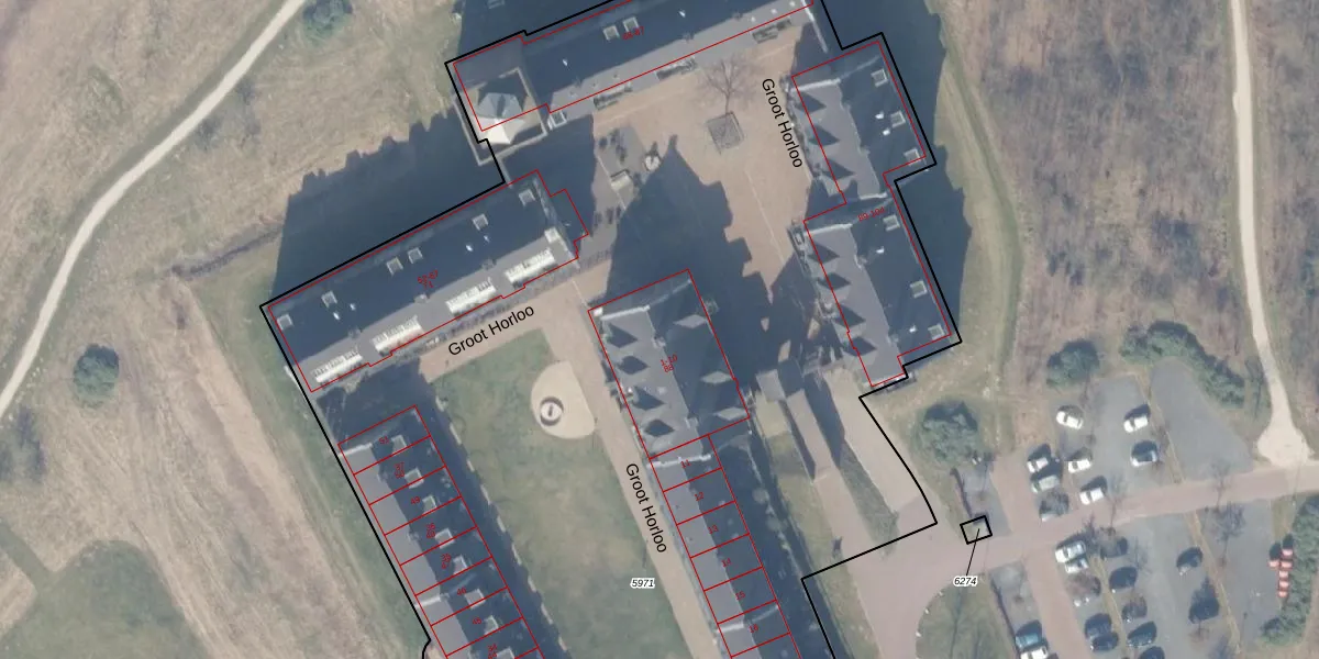 Het perceel waarop Groot Horloo 1 staat heeft een oppervlakte van 1,0 ha. Dit is een zeer groot perceel. De perceeloppervlakte wordt geregistreerd door het Kadaster. Gedetailleerde informatie over de maten van dit perceel kunt u vinden in het rapport Kadastrale kaart met maatvoering van Groot Horloo 1.