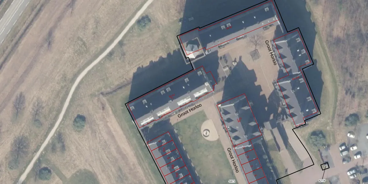 Het perceel waarop Groot Horloo 66 staat heeft een oppervlakte van 1,0 ha. Dit is een zeer groot perceel. De perceeloppervlakte wordt geregistreerd door het Kadaster. Gedetailleerde informatie over de maten van dit perceel kunt u vinden in het rapport Kadastrale kaart met maatvoering van Groot Horloo 66.