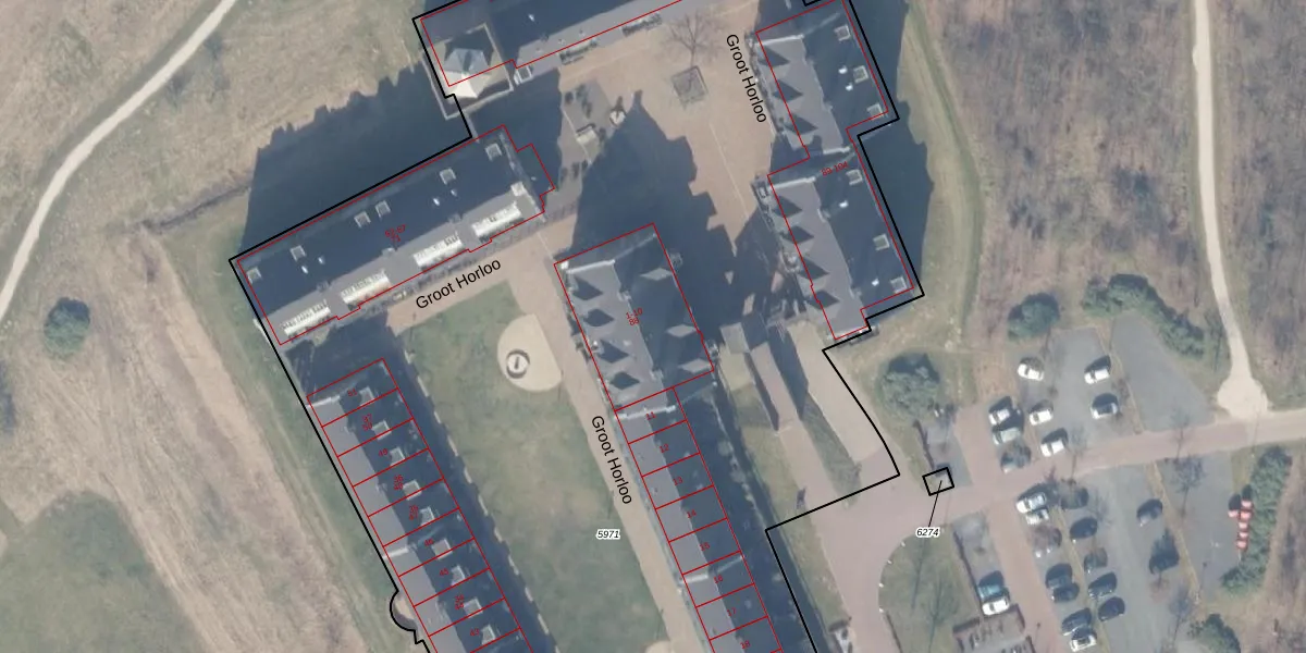 Het perceel waarop Groot Horloo 7 staat heeft een oppervlakte van 1,0 ha. Dit is een zeer groot perceel. De perceeloppervlakte wordt geregistreerd door het Kadaster. Gedetailleerde informatie over de maten van dit perceel kunt u vinden in het rapport Kadastrale kaart met maatvoering van Groot Horloo 7.
