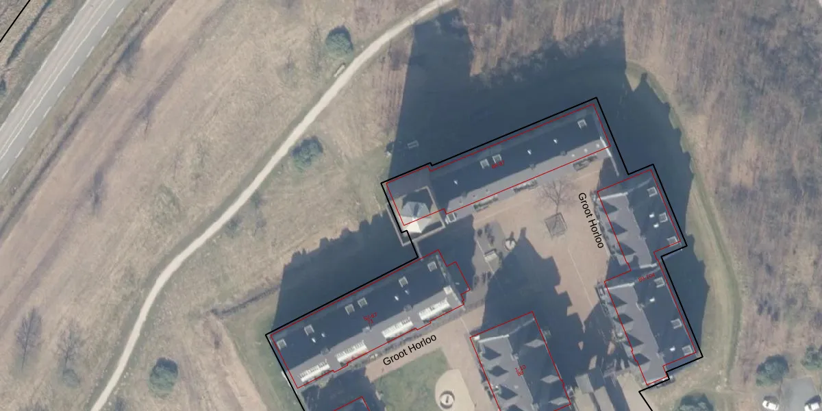Het perceel waarop Groot Horloo 70 staat heeft een oppervlakte van 1,0 ha. Dit is een zeer groot perceel. De perceeloppervlakte wordt geregistreerd door het Kadaster. Gedetailleerde informatie over de maten van dit perceel kunt u vinden in het rapport Kadastrale kaart met maatvoering van Groot Horloo 70.