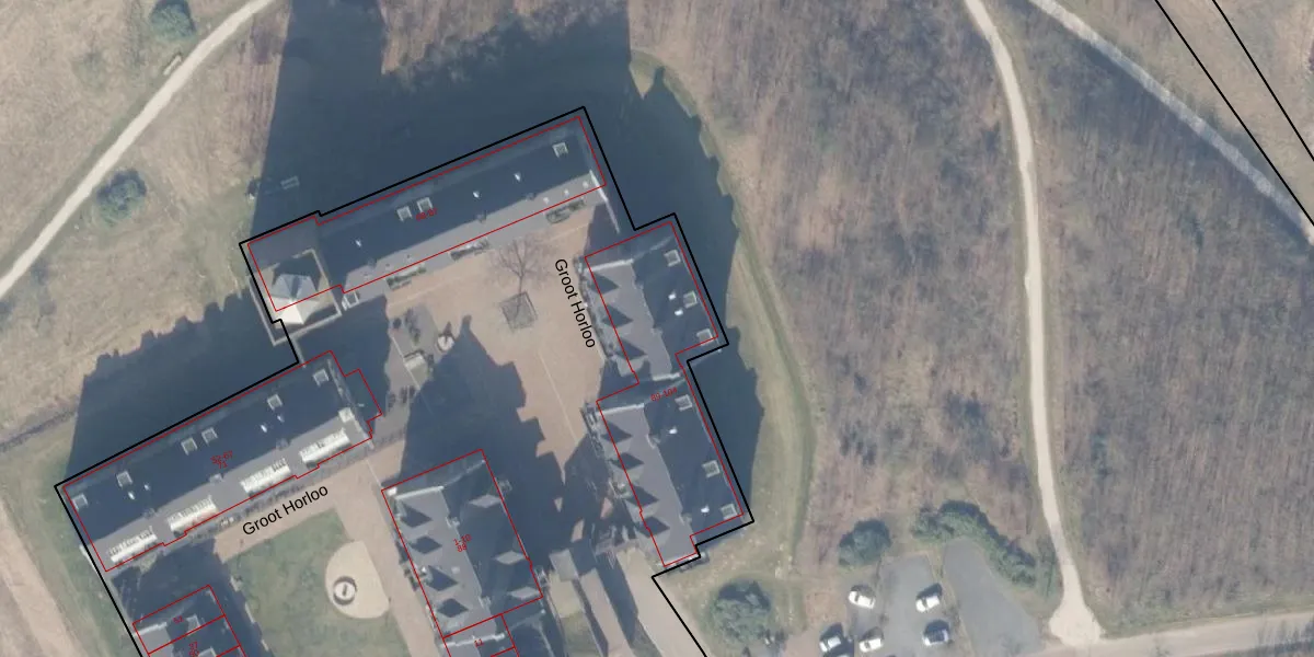 Het perceel waarop Groot Horloo 89 staat heeft een oppervlakte van 1,0 ha. Dit is een zeer groot perceel. De perceeloppervlakte wordt geregistreerd door het Kadaster. Gedetailleerde informatie over de maten van dit perceel kunt u vinden in het rapport Kadastrale kaart met maatvoering van Groot Horloo 89.
