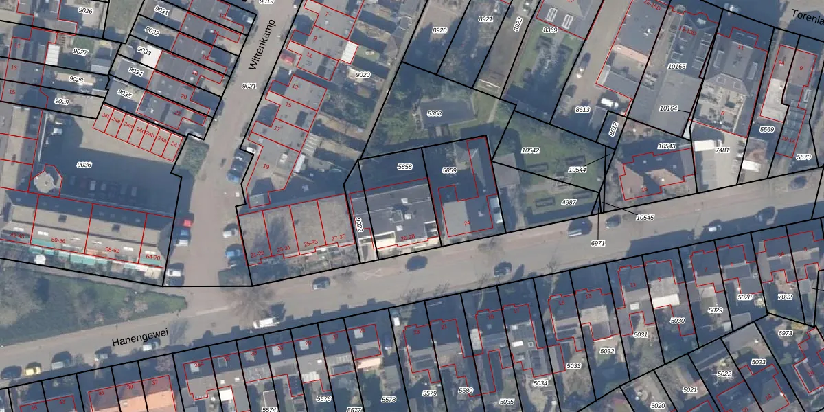 Het perceel waarop Hanengewei 26 staat heeft een oppervlakte van 387 m². Dit is een groot perceel. De perceeloppervlakte wordt geregistreerd door het Kadaster. Gedetailleerde informatie over de maten van dit perceel kunt u vinden in het rapport Kadastrale kaart met maatvoering van Hanengewei 26.