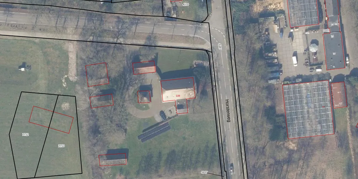 Het perceel waarop Horsterweg 239 staat heeft een oppervlakte van 2,3 ha. Dit is een zeer groot perceel. De perceeloppervlakte wordt geregistreerd door het Kadaster. Gedetailleerde informatie over de maten van dit perceel kunt u vinden in het rapport Kadastrale kaart met maatvoering van Horsterweg 239.