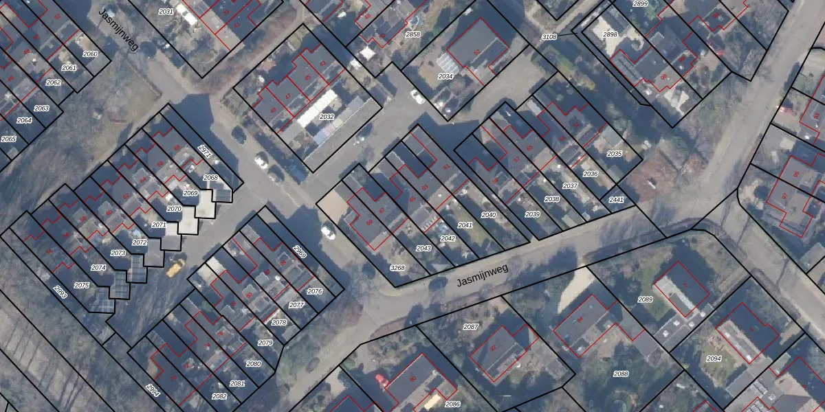 Het perceel waarop Jasmijnweg 65 staat heeft een oppervlakte van 187 m². Dit is een middelgroot perceel. De perceeloppervlakte wordt geregistreerd door het Kadaster. Gedetailleerde informatie over de maten van dit perceel kunt u vinden in het rapport Kadastrale kaart met maatvoering van Jasmijnweg 65.