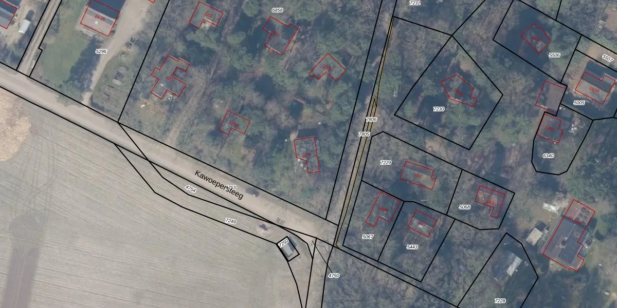Het perceel waarop Kawoepersteeg 22-9 staat heeft een oppervlakte van 7598 m². Dit is een zeer groot perceel. De perceeloppervlakte wordt geregistreerd door het Kadaster. Gedetailleerde informatie over de maten van dit perceel kunt u vinden in het rapport Kadastrale kaart met maatvoering van Kawoepersteeg 22-9.