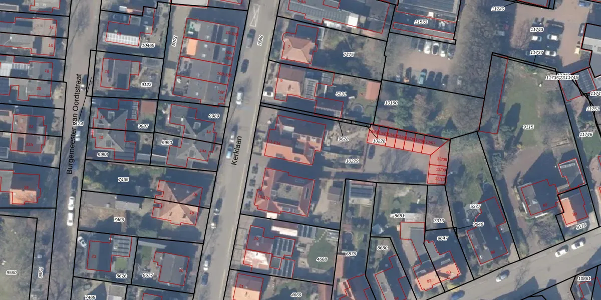 Het perceel waarop Kerklaan 13-A staat heeft een oppervlakte van 1734 m². Dit is een zeer groot perceel. De perceeloppervlakte wordt geregistreerd door het Kadaster. Gedetailleerde informatie over de maten van dit perceel kunt u vinden in het rapport Kadastrale kaart met maatvoering van Kerklaan 13-A.