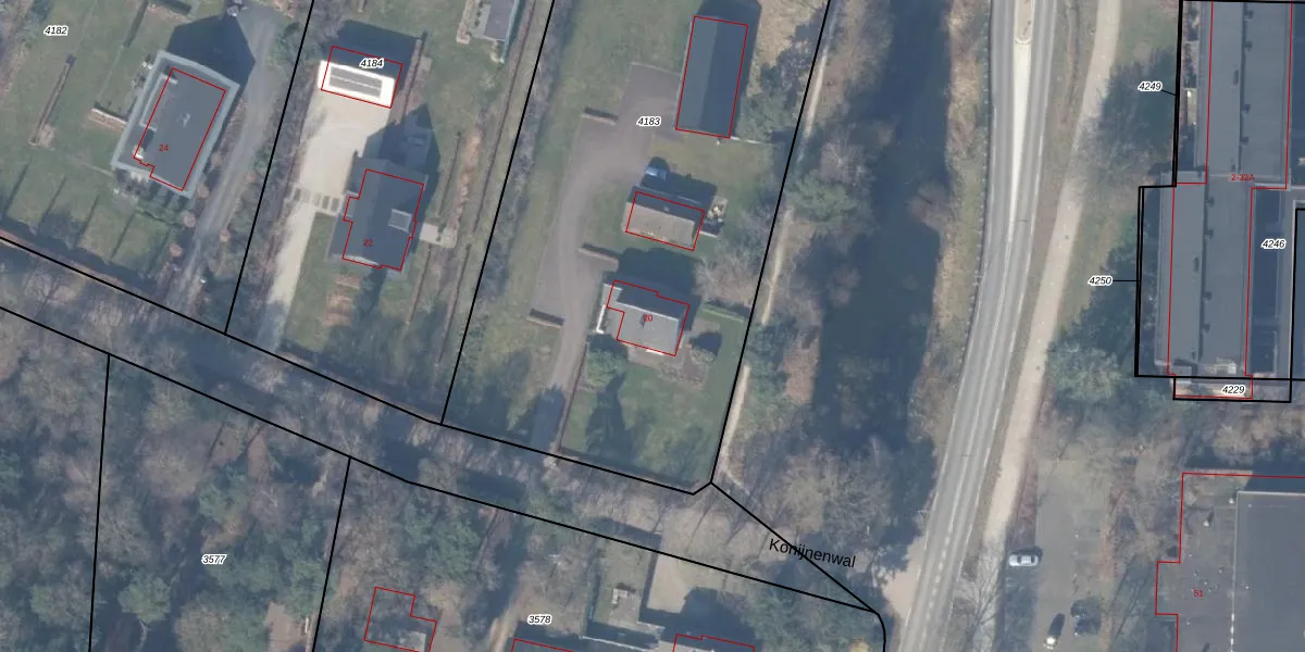 Het perceel waarop Konijnenwal 20 staat heeft een oppervlakte van 3620 m². Dit is een zeer groot perceel. De perceeloppervlakte wordt geregistreerd door het Kadaster. Gedetailleerde informatie over de maten van dit perceel kunt u vinden in het rapport Kadastrale kaart met maatvoering van Konijnenwal 20.