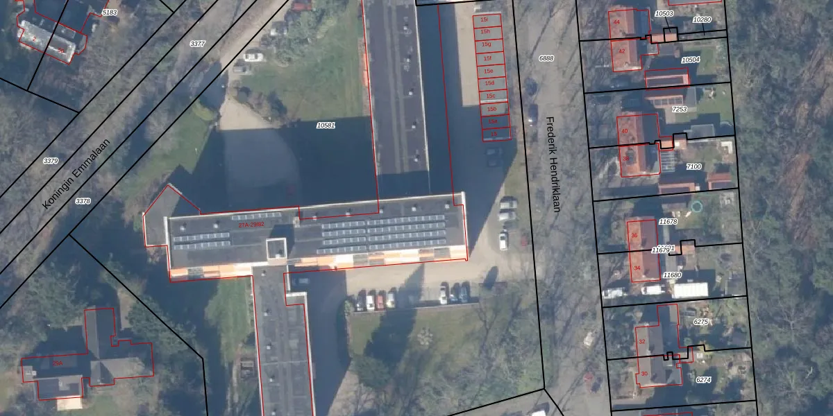 Het perceel waarop Koningin Emmalaan 29-53 staat heeft een oppervlakte van 9195 m². Dit is een zeer groot perceel. De perceeloppervlakte wordt geregistreerd door het Kadaster. Gedetailleerde informatie over de maten van dit perceel kunt u vinden in het rapport Kadastrale kaart met maatvoering van Koningin Emmalaan 29-53.