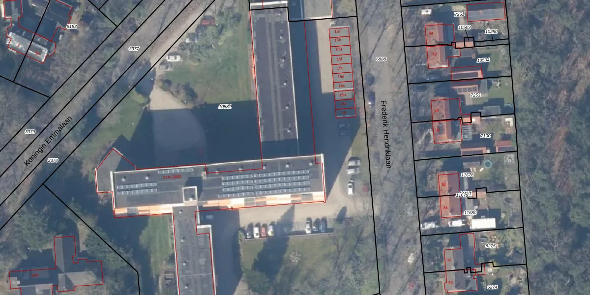 Het perceel waarop Koningin Emmalaan 29-25 staat heeft een oppervlakte van 9195 m². Dit is een zeer groot perceel. De perceeloppervlakte wordt geregistreerd door het Kadaster. Gedetailleerde informatie over de maten van dit perceel kunt u vinden in het rapport Kadastrale kaart met maatvoering van Koningin Emmalaan 29-25.