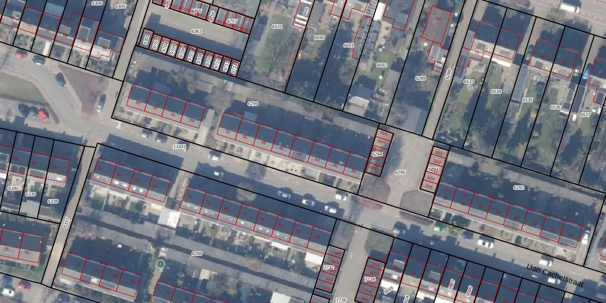 Het perceel waarop Lion Cachetstraat 44 staat heeft een oppervlakte van 2121 m². Dit is een zeer groot perceel. De perceeloppervlakte wordt geregistreerd door het Kadaster. Gedetailleerde informatie over de maten van dit perceel kunt u vinden in het rapport Kadastrale kaart met maatvoering van Lion Cachetstraat 44.