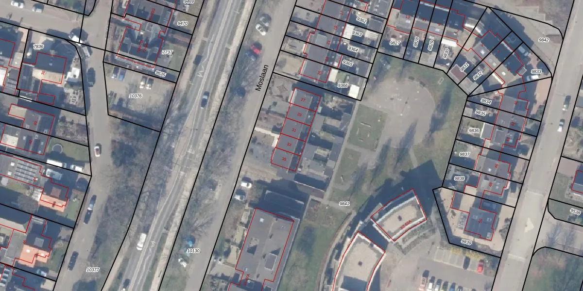 Het perceel waarop Moslaan 33 staat heeft een oppervlakte van 9388 m². Dit is een zeer groot perceel. De perceeloppervlakte wordt geregistreerd door het Kadaster. Gedetailleerde informatie over de maten van dit perceel kunt u vinden in het rapport Kadastrale kaart met maatvoering van Moslaan 33.