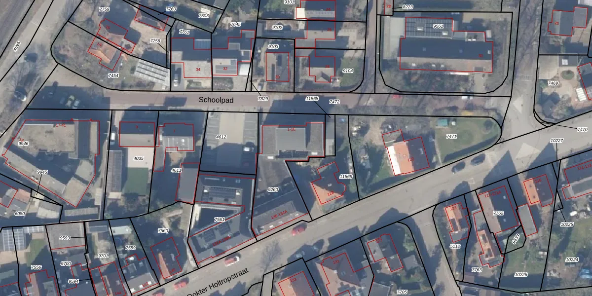 Het perceel waarop Schoolpad 1-E staat heeft een oppervlakte van 727 m². Dit is een groot perceel. De perceeloppervlakte wordt geregistreerd door het Kadaster. Gedetailleerde informatie over de maten van dit perceel kunt u vinden in het rapport Kadastrale kaart met maatvoering van Schoolpad 1-E.